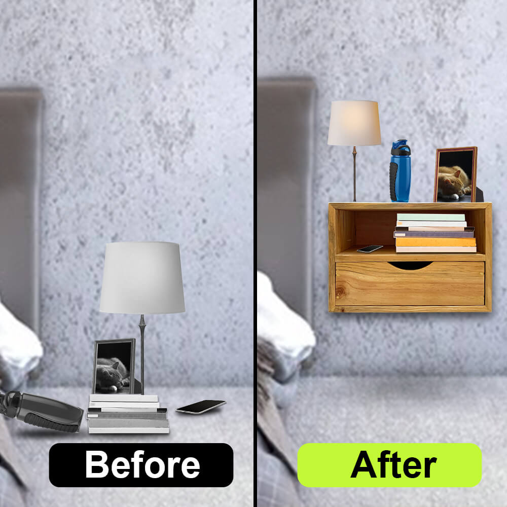 Bedvio has no sharp edges hence eliminating the risk potential scrapes or injuries. Bedvio being a floating nightstand makes it easier to clean the area. It is made up of high quality rubberwood, resistant to stains, hot water, and humidity so accidental spills don’t affect its quality