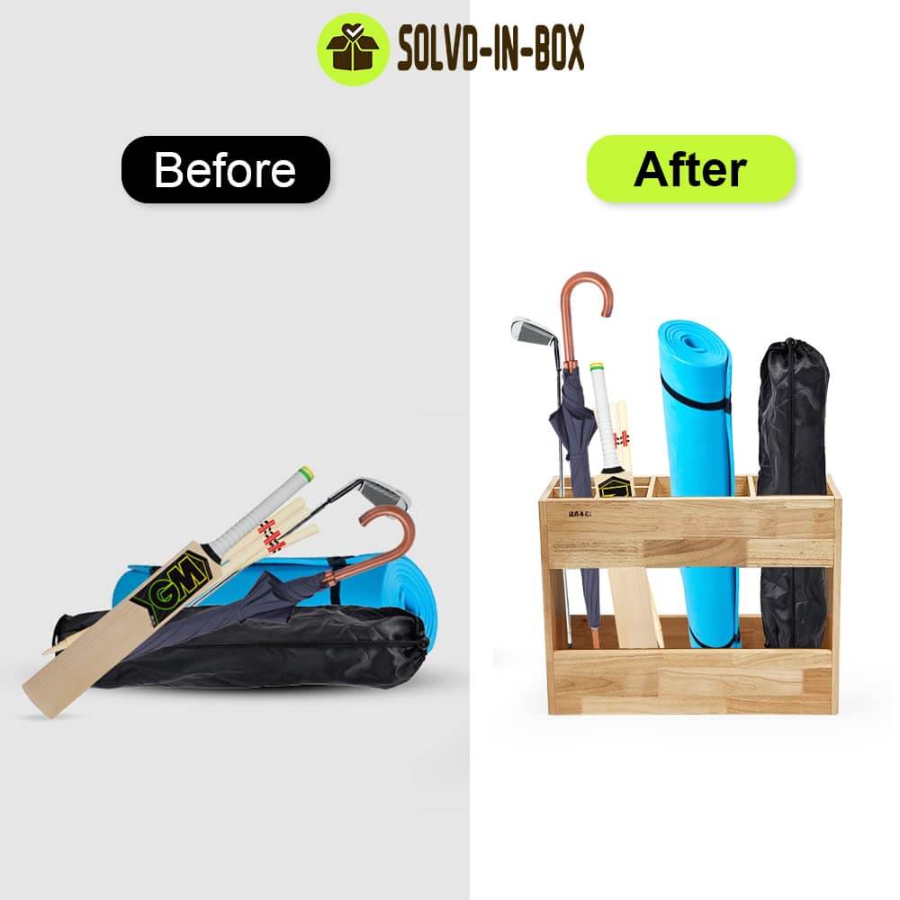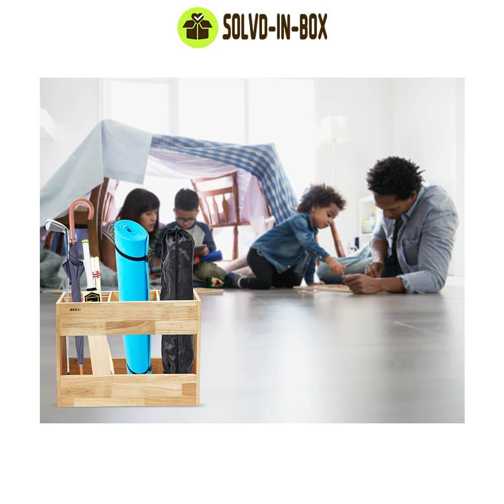 It comes with two bigger slots to keep your umbrellas, yoga mats, rugs, traditional mats, mops etc and 4 smaller slots to keep canes, walking sticks, accessories to cameras etc. It has a Hollowed-out body that allows umbrellas and other items to breath openly.